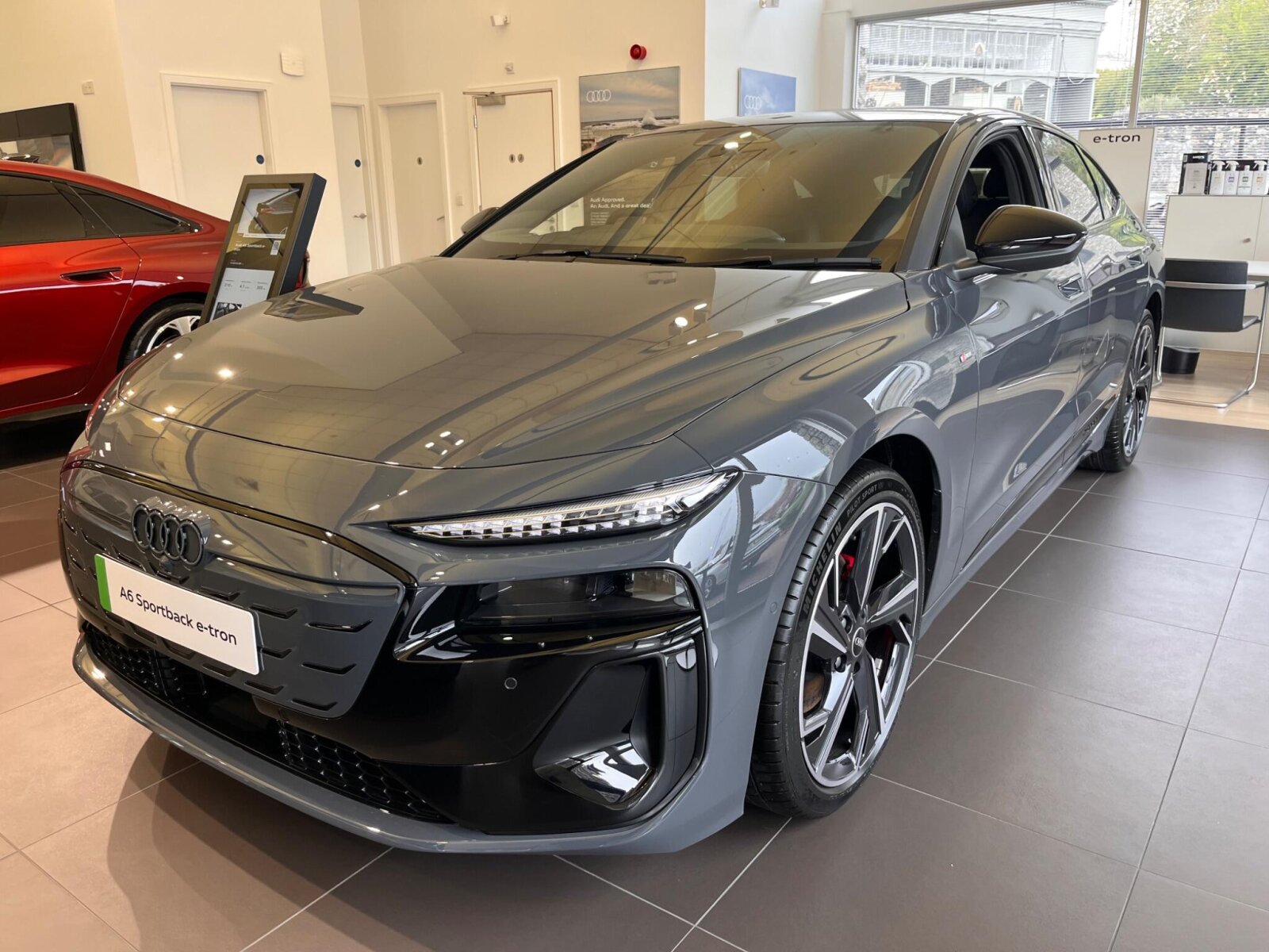 Window trim strips and attachments, dark with audi rings, front and rear in anthracite grey