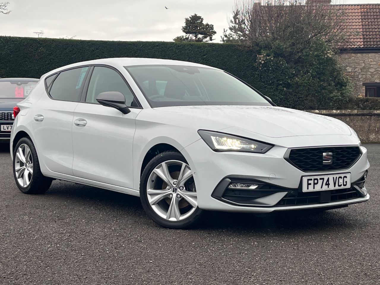 Flat bottomed perforated leather steering wheel with red stitching and FR logo and leather gear stick