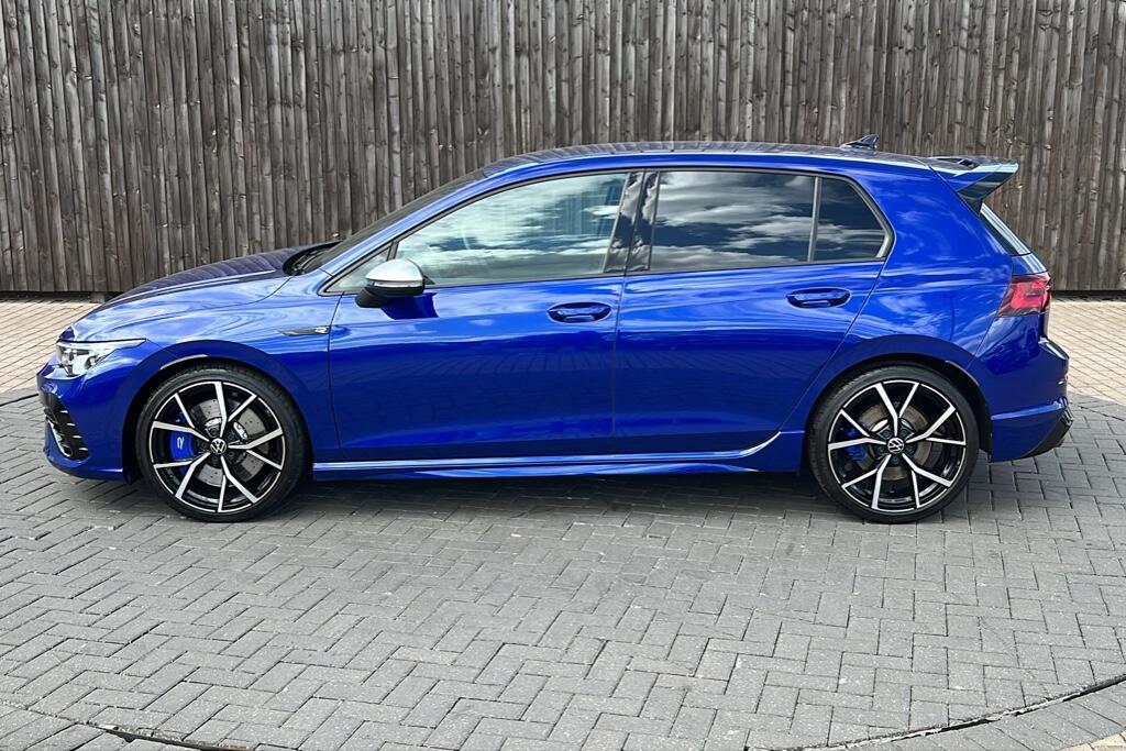 Blue brake callipers in front with R logo